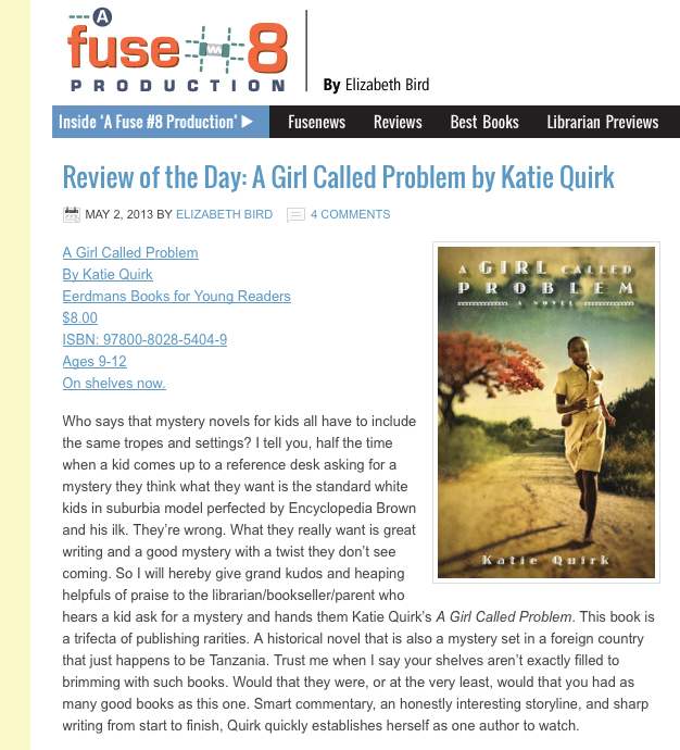 My experience on this front is limited, but relevant as the author of a book set in East Africa with a Tanzanian protagonist. When my agent started pitching A Girl Called Problem to editors at big publishing houses, many of them said this was a book that would sell in schools and libraries, but not in big chain bookstores, and these days just selling to schools and libraries involves too much financial risk. My response: thank goodness for small, independent publishers like Eerdmans Books for Young Readers, and Lee and Low, and for independent booksellers and librarians, like my town’s children’s librarian, who stock their shelves with books that truly reflect our diverse country and world.
