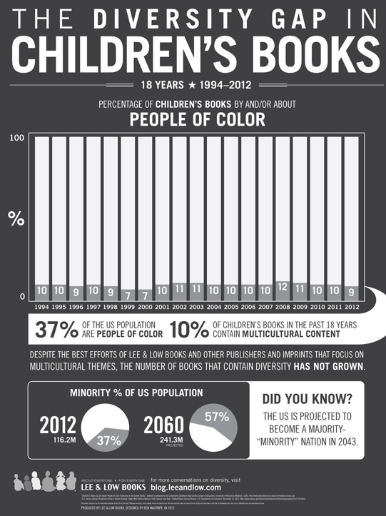 Lee and Low books, an independent publisher focused on diversity, recently shared some discouraging statistics: in the past 18 years, the publication of children’s books by and/or about people of color has plateaued, remaining at about 10%, even though 37% of the U.S. population are people of color. They went on to ask professionals in the field–authors, librarians, educators, reviewers–why they think this is the case. Their answers are interesting: the decline of school and library budgets, the buying habits of big box bookstores, a failure of children’s literature to embrace social movements (feminism, multiculturalism) in the way the grown-up literature has, and the reluctance of publishers to take on new authors (particularly authors of color). The full article can be found here.